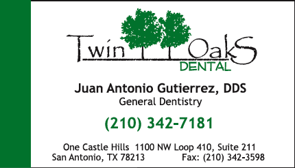 Twin Oaks Dental 1100 NW Loop 410, Suite 211 San Antonio, TX78213 United States ph: (210) 342-7181 twinoaksdental@hotmail.com